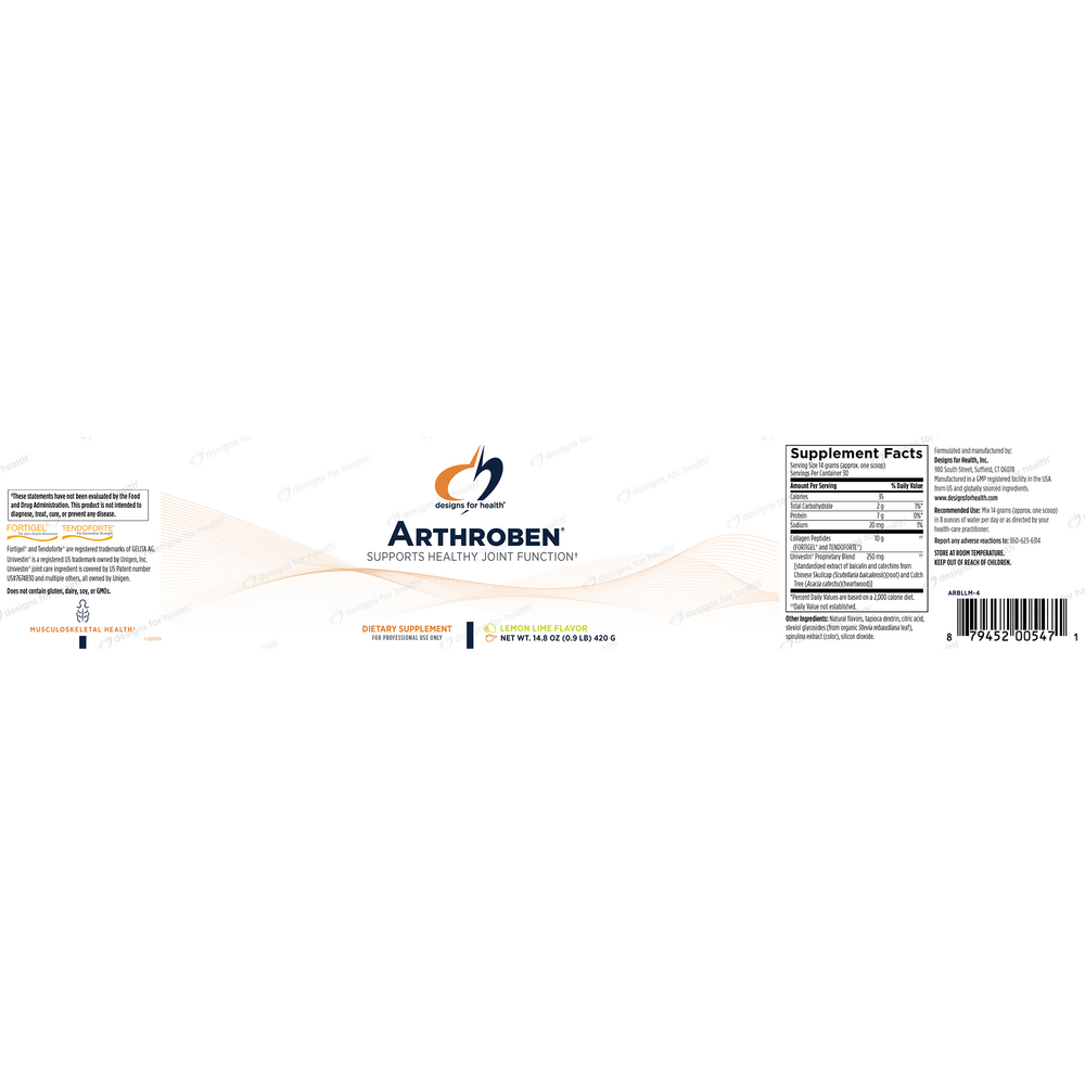 Arthroben® is a delicious tasting, highly absorbable powder designed to support healthy connective tissue and joint mobility. This formula features the patented collagen peptides Fortigel® and Tendoforte® that have been shown in studies to support joint function and promote tendon and ligament strength. Arthroben® also includes a proprietary blend of standardized extracts from Chinese skullcap (Scutellaria baicalensis) and cutch tree (Acacia catechu) to promote a normal inflammatory response, and it may help protect connective tissue from the damaging effects of free radicals.