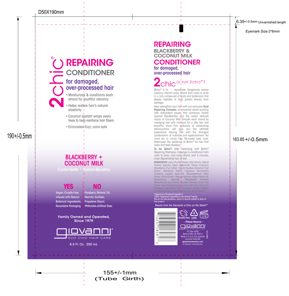 2chic® is to...repair and rejuvenate. Gorgeously restore vibrancy and repair open cuticles that cause frizz and flyaways with Giovanni's exclusive Dual Repairing Complex, an essential blend of Blackberries and Coconut Milk bursting with antioxidant power. Smooth each strand by indulging hair with moisture for a revitalized and beautiful shine. 2chic Repairing Conditioner is powered by botanical extracts and oils with nourishing and restorative properties that balance pH levels in weak, thin, or damaged hair. Shea Butter, Keratin, and Jojoba are added to regain that luxurious appearance and softness once again. 2chic for hair that looks and feels flawless.