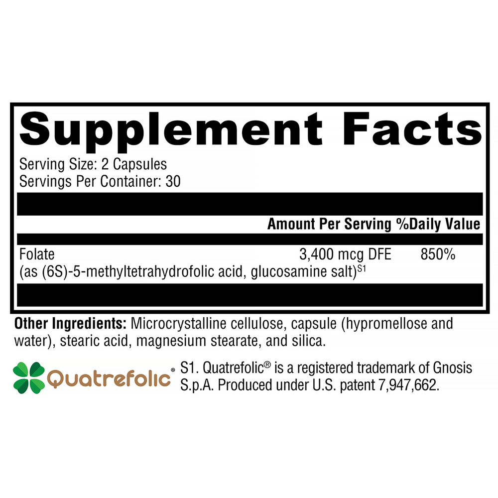 5-MTHF, provided as Quatrefolic, is the most biologically active form of the water-soluble B vitamin, folic acid. It is the preferred form of folate supplementation due to an array of conditions that can limit conversion or absorption of folic acid. Data indicate that supplementing with 5-MTHF increases plasma folate more effectively than folic acid.*
