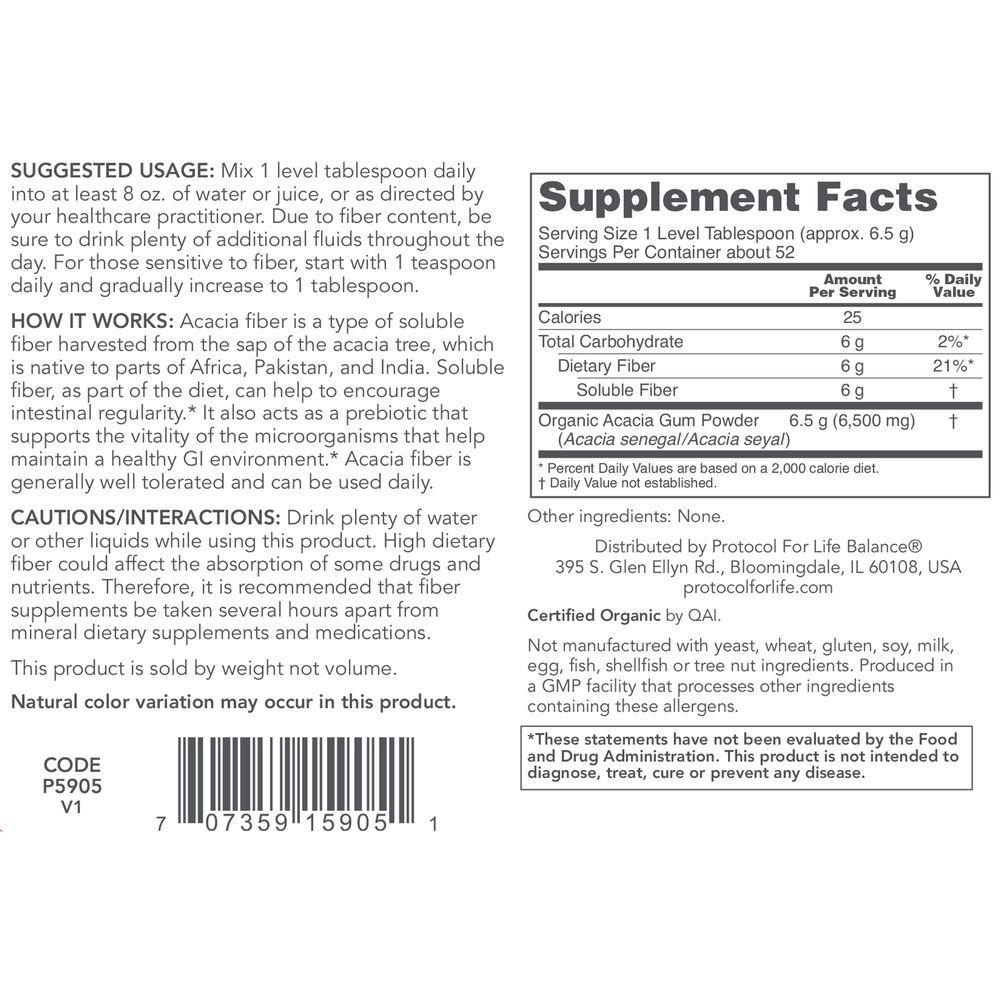 Acacia powder is harvested from the sap of the acacia tree, which is native to parts of Africa, Pakistan, and India. It acts as a prebiotic that supports the vitality of the microorganisms that help maintain a healthy GI environment.* Acacia powder is generally well tolerated and can be used daily.