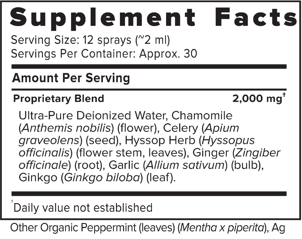 Proprietary Blend (Ultra-pure deionized water, Chamomile [Matricaria chamomilla] flower, Celery [Apium graveolens] seed, Hyssop herb [Hyssopus officinalis] flower stem and leaves, Ginger [Zingiber officinale] root, Garlic [Allium sativum] bulb, Ginkgo [Ginkgo biloba] leaf) ... 2,000 mg