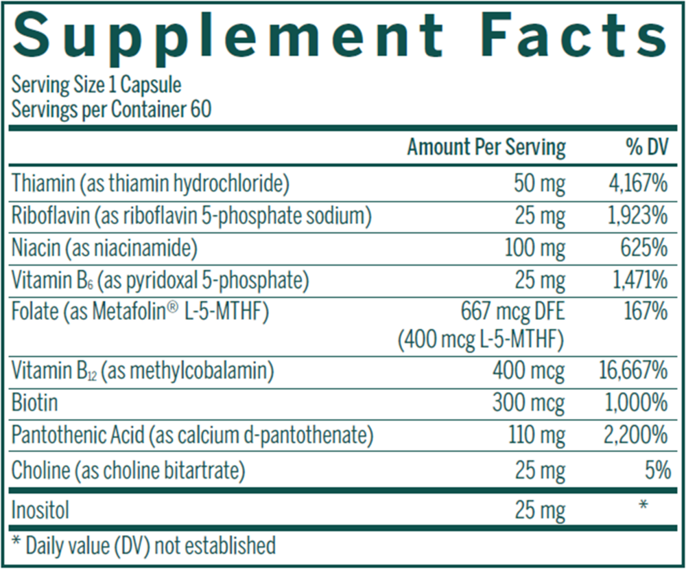 ACTIVE B Complex supports the formation of healthy red blood cells and macronutrient metabolism. Each capsule provides the entire B-vitamin family, including vitamins B1, B2, B3, pantothenic acid B6, biotin, folate, and B12. Active B Complex uses the preferred active forms of vitamins B2 (riboflavin-5-phosphate), B6 (pyridoxal-5-phosphate), folate (Metafolin®), and B12 (methylcobalamin). Metafolin®, a calcium salt of L-methylfolate, may be more bioavailable than folic acid. In one study involving healthy women supplemented with 400 mcg of either L-methylfolate or folic acid for 24 weeks, the women receiving the L-methylfolate supplement had higher red blood cell folate concentrations.*