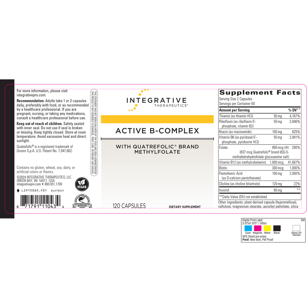B-vitamins play many essential roles in many functions of the body, including daily energy support, neutrotransmitter production, and nerve function.* Active B-Complex is a potent blend containing all 8 B-vitamins, including the active forms of vitamins B2, B6, and B12, as well as Quatrefolic-branded methylfolate (the bioactive form of folate). Each B-vitamin exists in multiple forms, often referred to as vitamers. Active forms of vitamers are those that can be directly utilized by the body immediately.