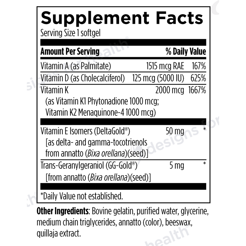 ADK Evail™ provides 5,000 IUs of vitamin D, along with clinically relevant dosages of vitamins A and K, and vitamin E isomers. The formula is designed to support balance when supplementing these fat-soluble micronutrients, which function in intricate inter-relationships with each other. High-dose supplementation of only one of the fat-soluble vitamins could lead to a relative deficiency of other fat-soluble vitamins and result in unwanted side effects.