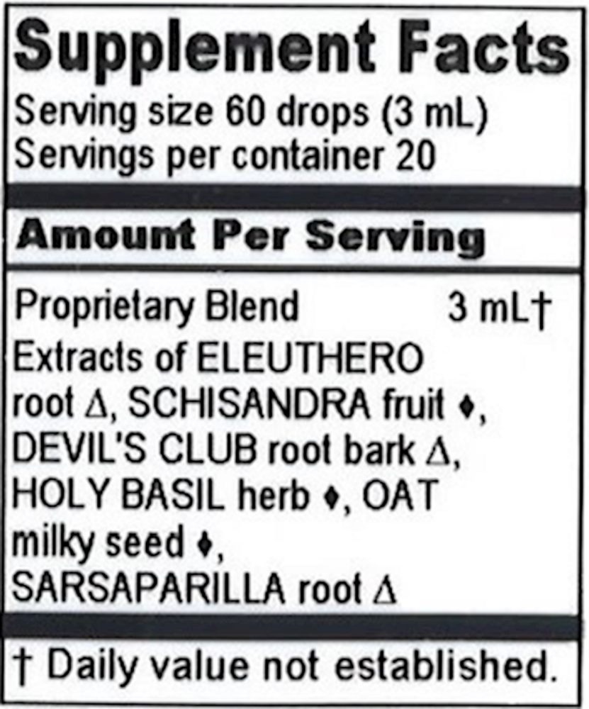 Eleuthero root (Eleutherococcus senticosus), Schisandra fruit (Schisandra chinensis), Codonopsis root (Codonopsis pilosula), Devil's Club root bark (Oplopanax horridus), Holy Basil herb (Ocimum tenuiflorum), Oat milky seed (Avena sativa)