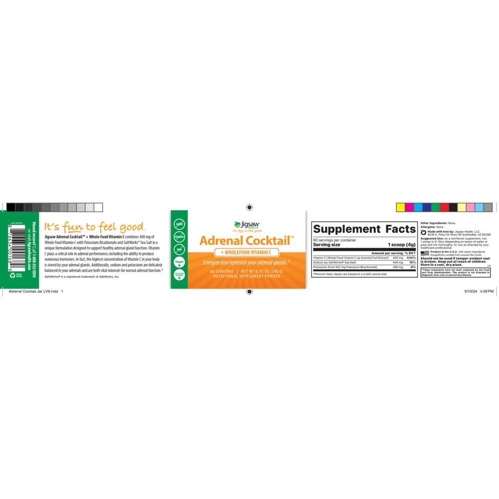 The Jigsaw Adrenal Cocktail combines Whole Food Vitamin C, Potassium Bicarbonate, and Redmond’s Real Salt® in a unique formulation designed to support healthy adrenal gland function. Vitamin C plays a critical role in adrenal function, including their ability to produce numerous hormones. In fact, the highest concentration of Vitamin C in your body is stored by your adrenal glands. Additionally, sodium and potassium play a delicate dance in your adrenals and are both vital minerals for normal adrenal function.