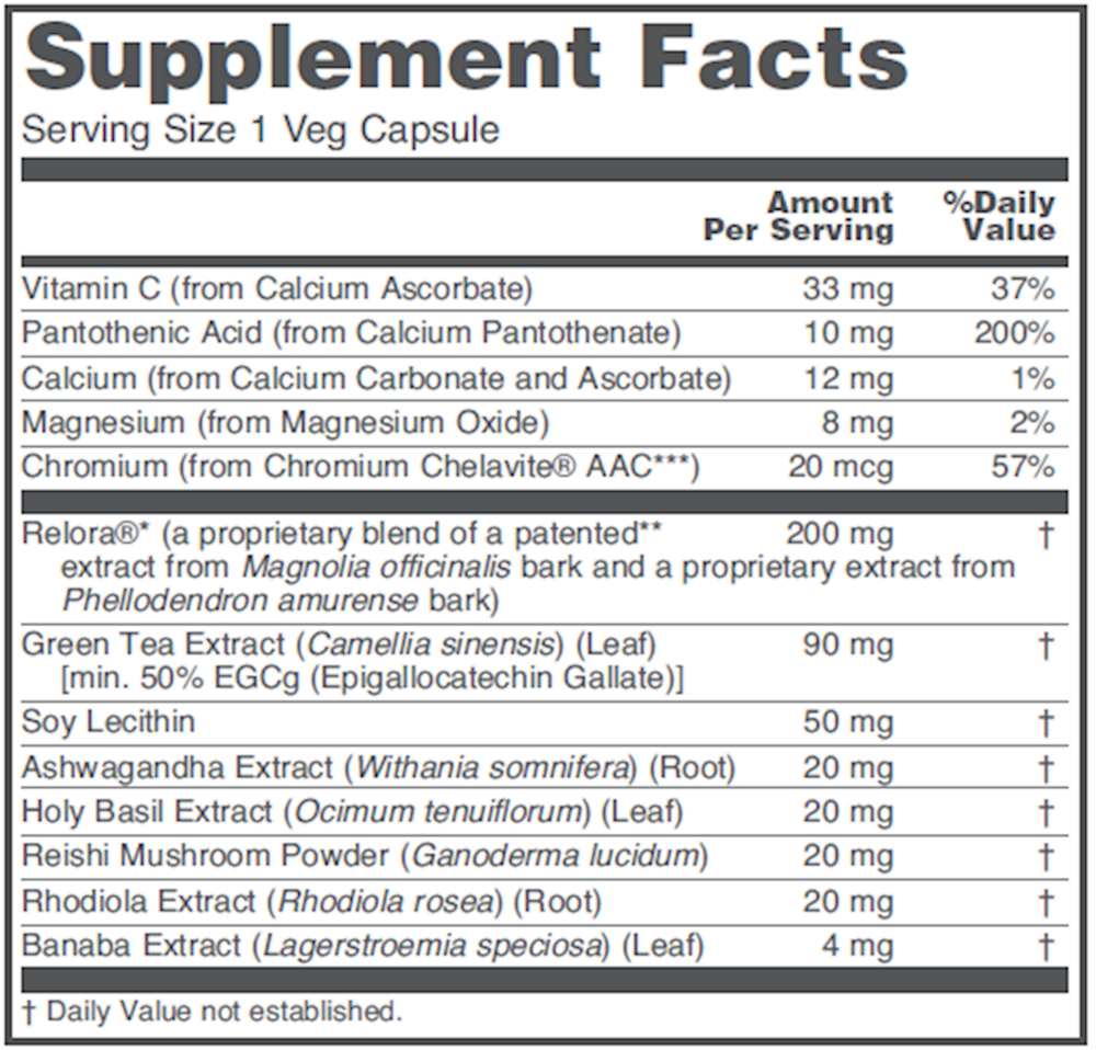 Everyday life stress can impact adrenal production of cortisol and trigger stress-related eating. Adrenal Cortisol Support™ is a botanical and nutritional formulation that naturally supports a normal adrenal response and helps to promote healthy blood sugar management.* Adrenal Cortisol Support™ features Relora™, a proprietary herbal combination that has clinically demonstrated that it can support healthy cortisol levels, temporarily relieve perceived daily stress, and help manage nervous appetite.*