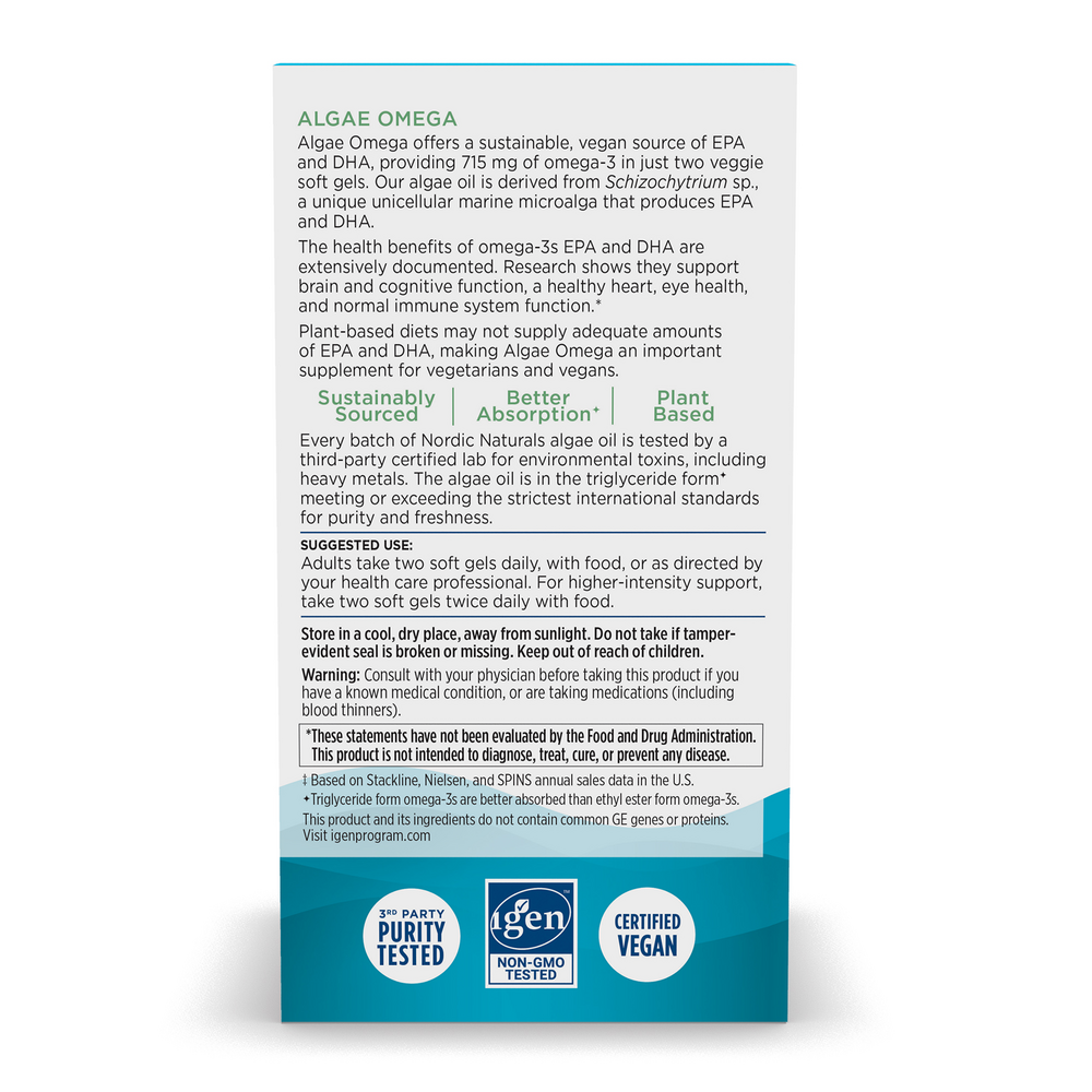 Nordic Naturals Algae Omega is the ideal vegetarian alternative to fish oil. Made from microalgae, it offers a plant-based source of beneficial marine omega-3s EPA and DHA without the use of fish. While most algae oils are short on EPA, Algae Omega's unique combination of EPA and DHA is a pure, safe, and effective source of both of these essential fatty acids.