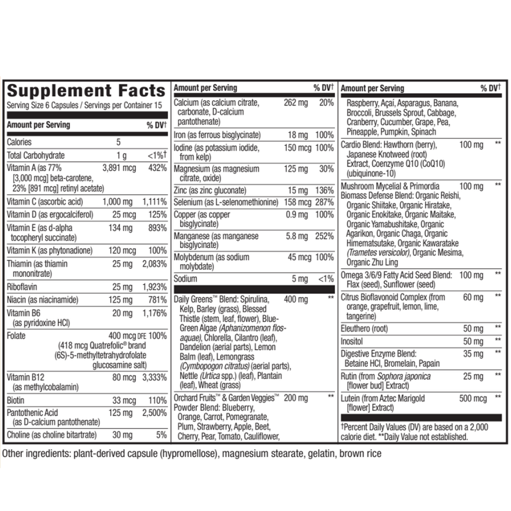 Daily Greens™ Blend: Spirulina, Kelp, Barley (grass), Blessed Thistle (stem, leaf, flower), Blue-Green Algae (Aphanizomenon flos-aquae), Chlorella, Cilantro (leaf), Dandelion (aerial parts), Lemon Balm (leaf), Lemongrass (Cymbopogon citratus) (aerial parts), Nettle (Urtica spp.) (leaf), Plantain (leaf), Wheat (grass) … 400mg