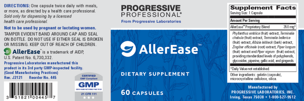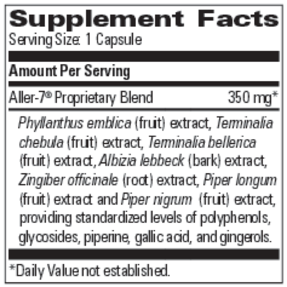 Ingredient Quantity Aller-7 Proprietary Blend 330 mg phyllanthus emblica fruit extract - Terminalia Chebula fruit extract - Terminalia Bellerica fruit extract - Albizia lebbeck bark - zingiber officinale root extract - Piper longum - Piper nigrum - Other Ingredients: gelatin (capsule), microcrystalline cellulose, silica.Serving size: 1 Capsule