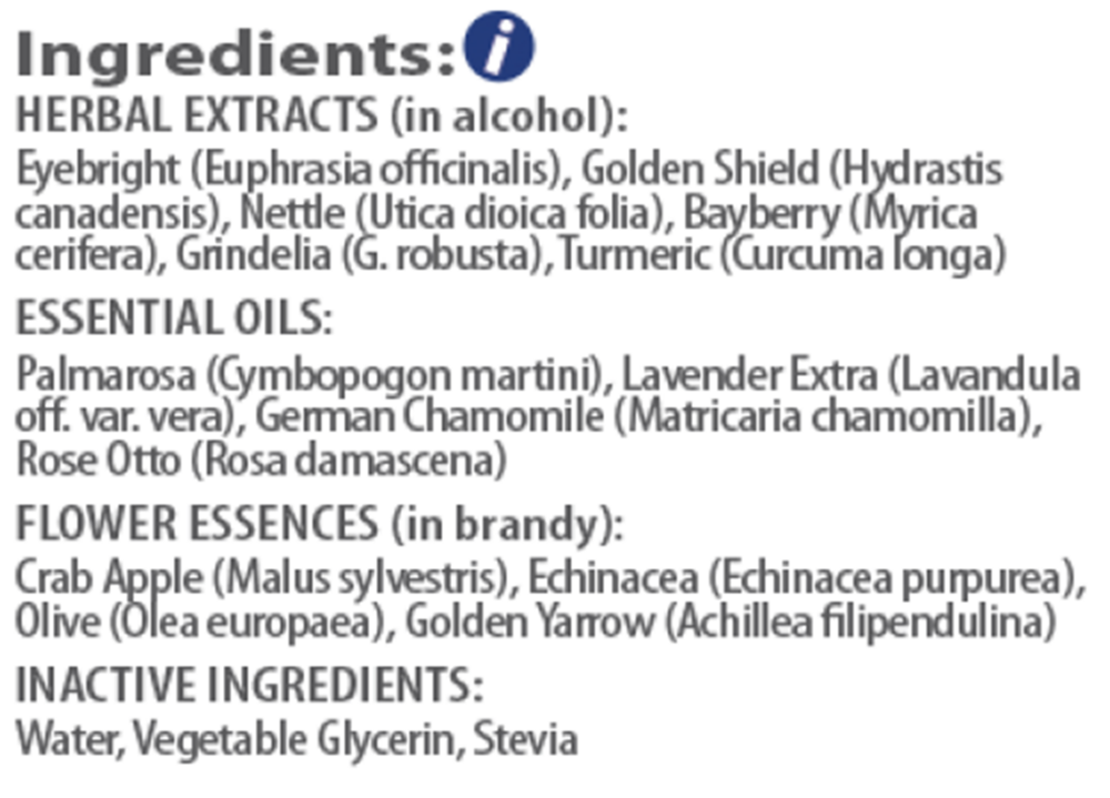 Amrita Aromatherapy's Allergy Relief helps your body maintain its own balance. This Tri-Essence Power Blend includes Nettle Leaf, Golden Seal, Eyebright, Bayberry, Grindelia, Turmeric, Palmarosa, Lavender, Crab Apple Flower, Echinacea, Olive, Golden Yarrow, German Chamomile, and Rose Otto. Fortify your spirit with integrity, while protecting your inner purity and vulnerability.