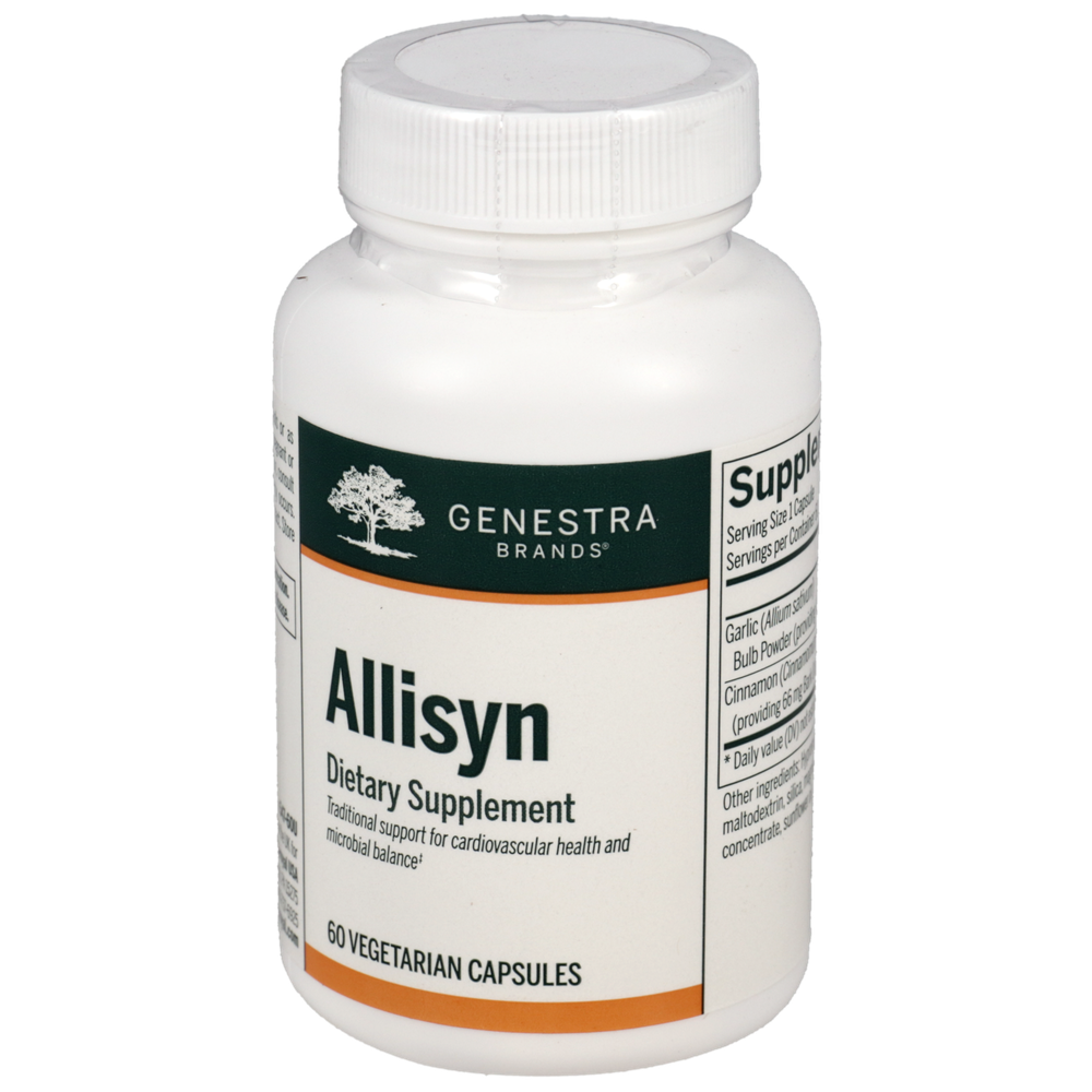 Allisyn is a blend of allicin and cinnamaldehyde that is traditionally used in herbal medicine to support optimal cardiovascular health. The main bioactive compound in garlic is allicin. When broken down, this sulfur-containing compound is responsible for the characteristic odor of garlic. Recent research indicates that long-term garlic consumption may support healthy lipid metabolism. In a randomized, placebo-controlled trial involving 150 adults, daily supplementation with 800 mg of garlic powder capsules (providing 2 mg of allicin) for six weeks supported cardiovascular health.*