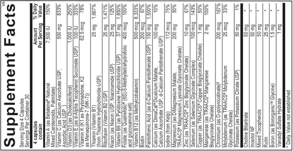 Alpha Base is a comprehensive, hypo-allergenic, multivitamin and mineral blend. As a complete multivitamin, Alpha Base provides high-quality nutrients to build a healthy micronutrient reserve. USP† B vitamins support energy production and folate (as Quatrefolic™ - 100% 5-MTHF), the biologically active form of folic acid, improves methylation. Albion® TRAACS® chelated mineral complexes enhance bioavailability. Alpha Base includes an optimal 2:1 magnesium to calcium ratio. Key antioxidant vitamin C, natural vitamin E mixed tocopherols and carotenoids protect cells from free radical damage. Alpha Base also contains the synergistic blend of vitamin K2 (as MK-7) and D3 which are critical for supporting bone strength and cardiovascular health.*