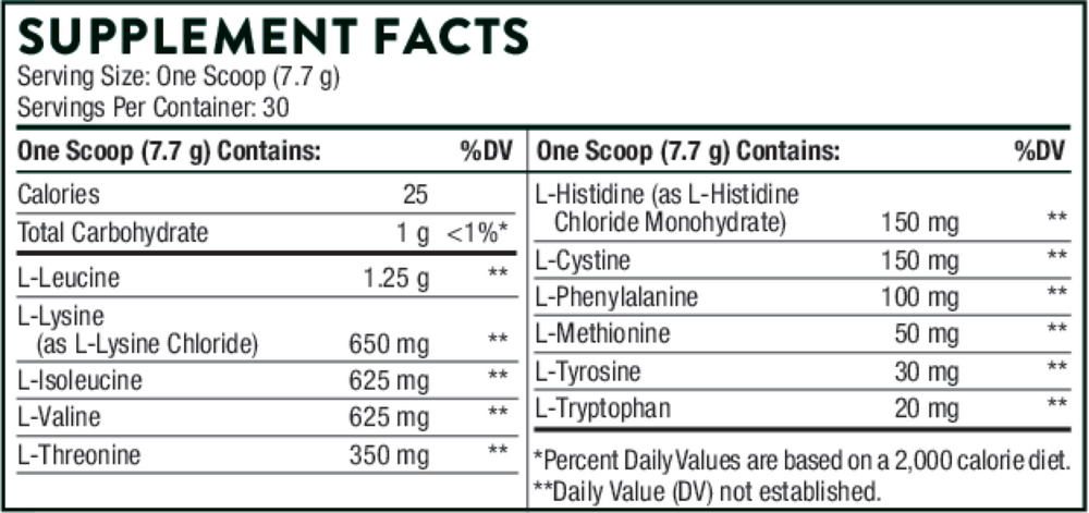 Amino Complex is a comprehensive blend of essential amino acids. It is best taken after a workout to help trigger the recovery process.* NSF Certified for Sport®Amino Complex supports sports-related, fitness-related, and training-related activities, and it supports the increase of muscle mass for someone needing that benefit.* Amino acid supplementation can help decrease fat synthesis, improve redox status, and support energy production via activation of NRF-2 and PGC-1alpha.* Amino acids also support mitochondrial biogenesis – the body's internal production of energy.*The comprehensive blend of essential amino acids in Amino Complex is high in branched-chain amino acids, a group of amino acids that have been scientifically shown to support lean muscle mass and muscle strength.* Amino Complex comes in two flavors, lemon and berry, and is lightly sweetened. It mixes easily with warm or cold liquids, has no artificial sweeteners, and contains flavors only derived from natural sources.• Muscle/Tendon*