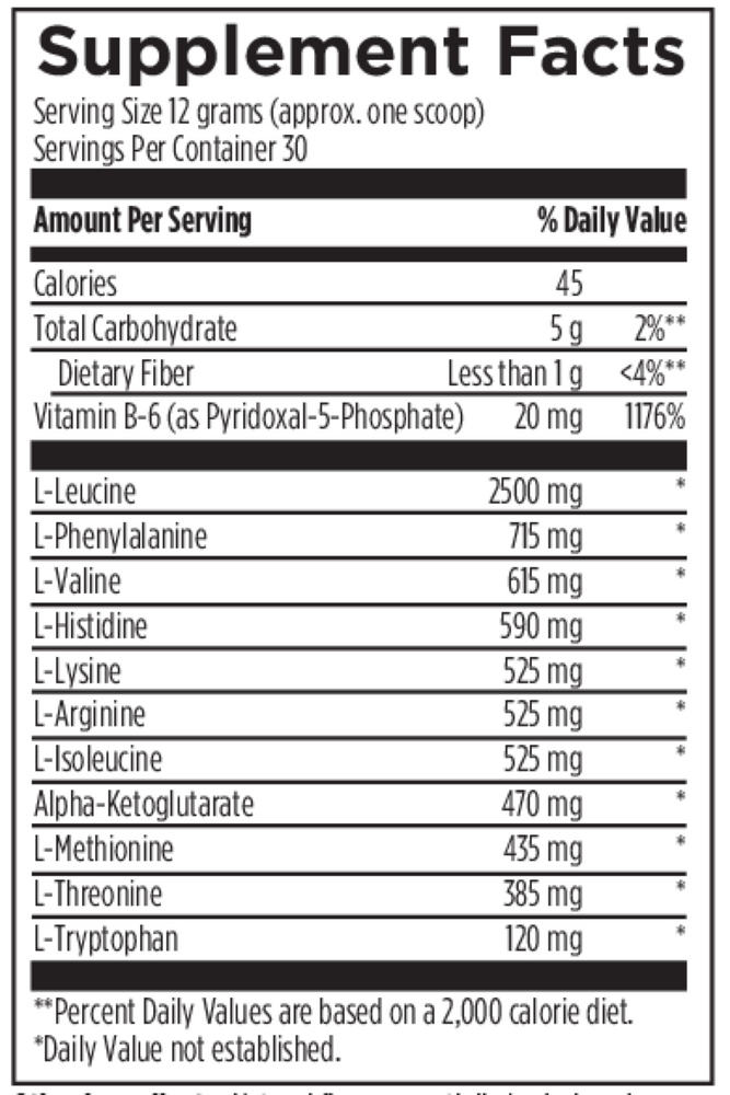 Amino Complex is a balanced, amino acid formula in a great tasting orange flavored powder. It provides essential amino acids in their free form, which makes them immediately available for absorption. This allows them to be put to metabolic use much more readily and rapidly than amino acids contained in dietary protein. Alpha-ketoglutarate and vitamin B6 (as pyridoxal-5-phosphate) are included for optimal absorption and efficacy. Amino Complex contains zero grams of sugar and is sweetened with stevia.