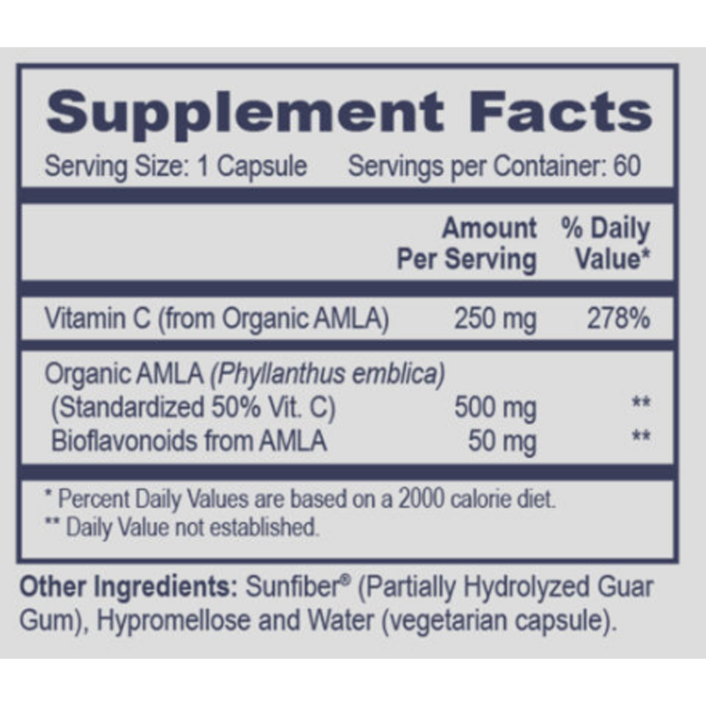AMLA-C is a natural form of Vitamin C, which is necessary for the growth, development, and repair of all body tissues. The benefits of Vitamin C supplementation include support for the immune system, adrenal function, collagen formation for healthy skin, and cardiovascular health. Vitamin C is a potent antioxidant, neutralizing free radicals, also helping to recycle vitamin E and glutathione. AMLA may also provide antifungal, antibacteria effects in the gut.