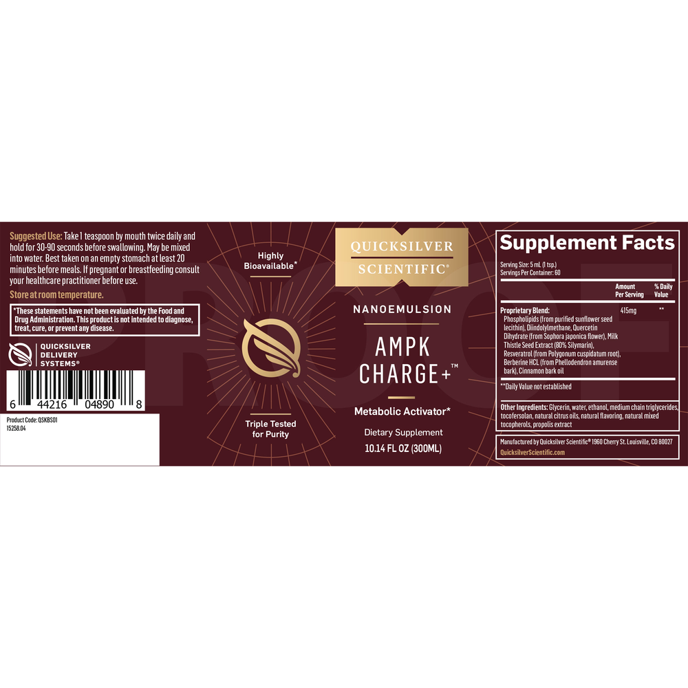 AMPK Charge+™ is an innovative phytonutrient formula designed to support activation of the metabolic AMPK pathway, a critical regulator of metabolism, healthy cell breakdown and growth, and body weight. AMPK Charge+ can be used alone or in concert with intermittent fasting or carb-restricted diets to support metabolic health, normal inflammatory responses, energy production, fat breakdown, and longevity.*