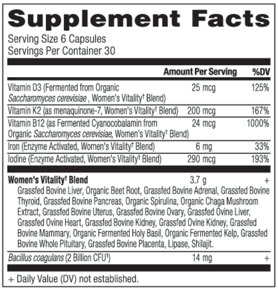 Promotes healthy elimination & digestive function*.This wild, grass-fed organ supplement blend is packed with history’s most powerful superfoods for women, designed to restore what the modern diet lacks.Ingredients for Female HealthThis blend combines organs, glands, and superfoods designed specifically to support women’s liver, thyroid, and adrenal health. That means bovine and ovine liver, adrenals, thyroid, mammary, placenta, uterus, and more. You’ll also get organic spirulina, chaga extract, holy basil, and beet root – all time-tested superfoods for women’s health – plus vitamins K2, D3, B12, and iron. Together, this formula delivers powerful support to balance hormones, promote healthy aging, and help women thrive.*
