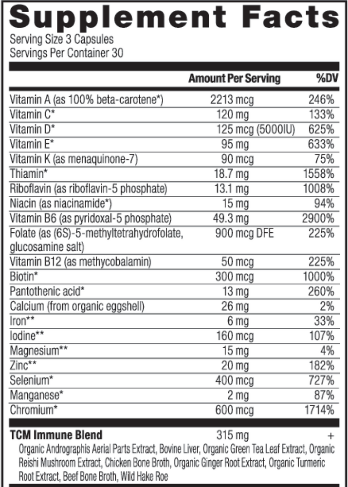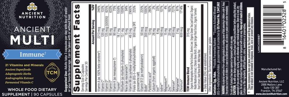 • TCM Formulation: A formulation more than 2,000 years in the making and built using the TCM (Traditional Chinese Method) of formulation, Ancient Multi Immune Support contains the time-tested superstars of TCM to bring a holistic approach to your daily multivitamin. Using the traditional Chinese approach to wellness, the aim is to tap into centuries-old ingredients and practices to support the body as a complete system rather than separate organs, a larger concept known as as “Qi.” TCM ingredients aim to balance and support qi, also known as life force.