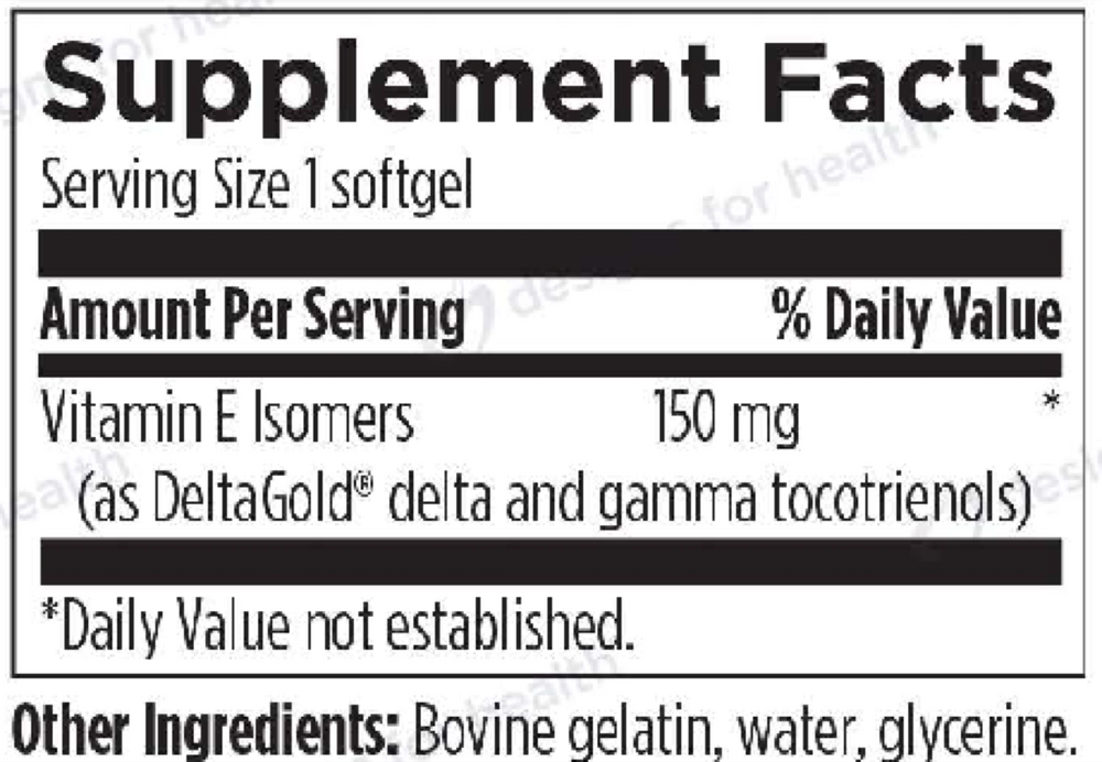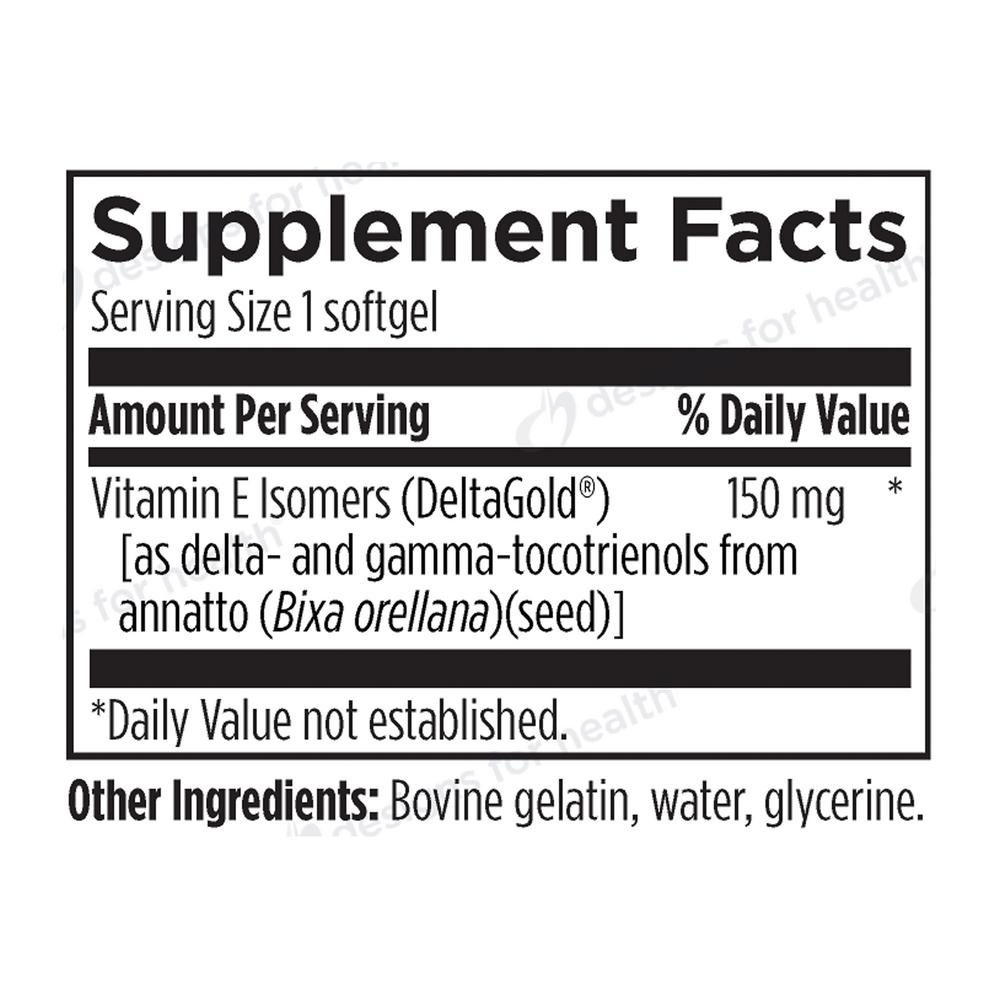 Annatto-E™ 150 is a unique tocopherol-free, tocotrienols-only product, featuring tocotrienols sourced from the annatto tree. Annatto is the richest known source of tocotrienols, containing 100% tocotrienols (90% delta and 10% gamma isomers), with no tocopherols. Annatto-E™ 150 contains 150 mg per softgel of delta/gamma tocotrienols. Commercial vitamin E supplements are typically rich in tocopherols and low or absent in tocotrienols; however, tocotrienol fractions have unique beneficial effects across a variety of tissues that make them desirable for supporting many aspects of health. Research indicates that tocopherols—especially alpha-tocopherol—may interfere with key therapeutic effects of tocotrienols, so it may be best to dose tocotrienols alone, without tocopherols.