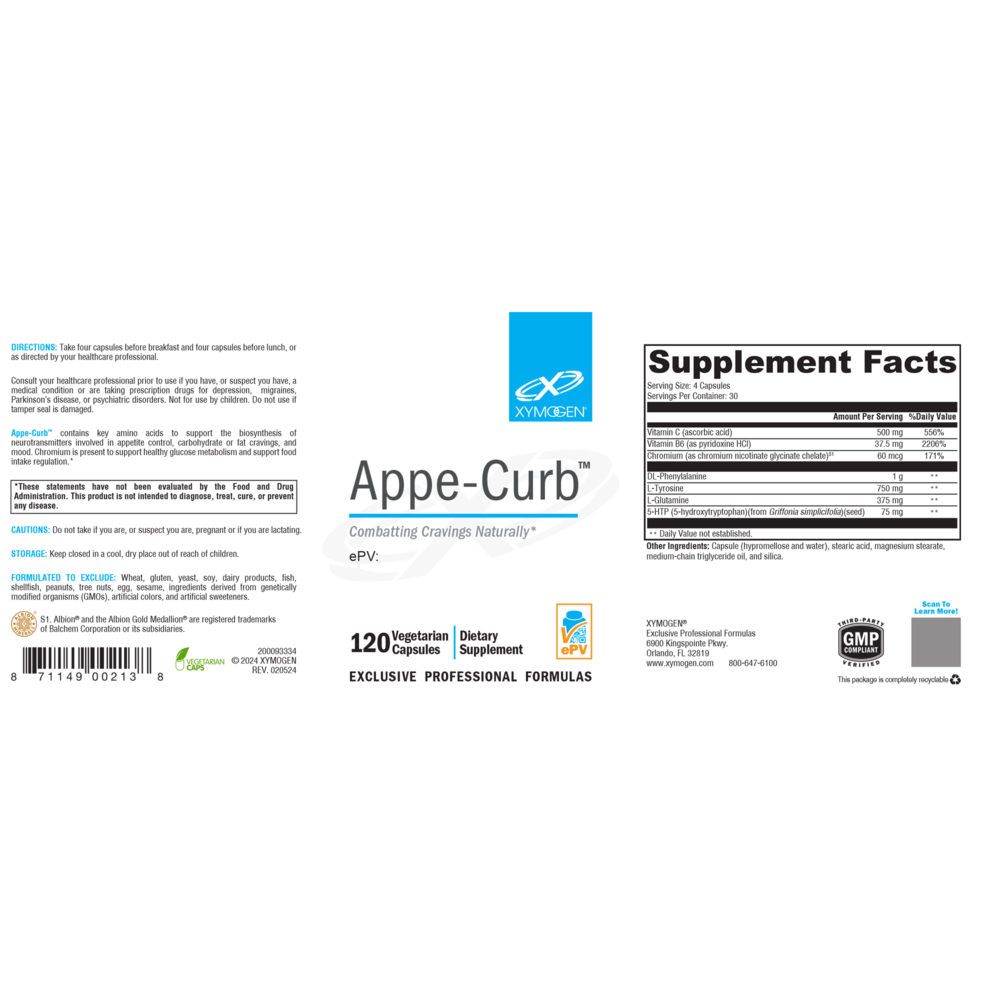 Appe-Curb™ contains key amino acids to support the biosynthesis of neurotransmitters involved in processes that influence appetite, carbohydrate or fat cravings, and mood. Chromium is present to support healthy glucose metabolism and support food intake regulation.*
