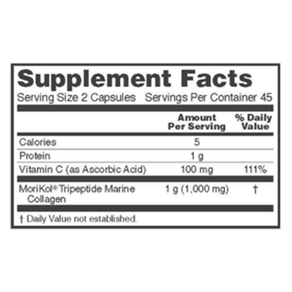 Clinically Validated Improves the Appearance of Facial Wrinkles within 12 Weeks* MoriKol® collagen tripeptides are small marine-derived collagen particles that are highly bioavailable, as they are absorbed intact into circulation.* Clinical studies have demonstrated that MoriKol® can improve skin hydration 3X within 6 weeks, and elasticity 6X within 12 weeks.* It has also been shown to improve the appearance of facial wrinkles 10X within 12 weeks.* Natural color variation may occur in this product. MoriKol® is a trademark of DolCas Biotech LLC.