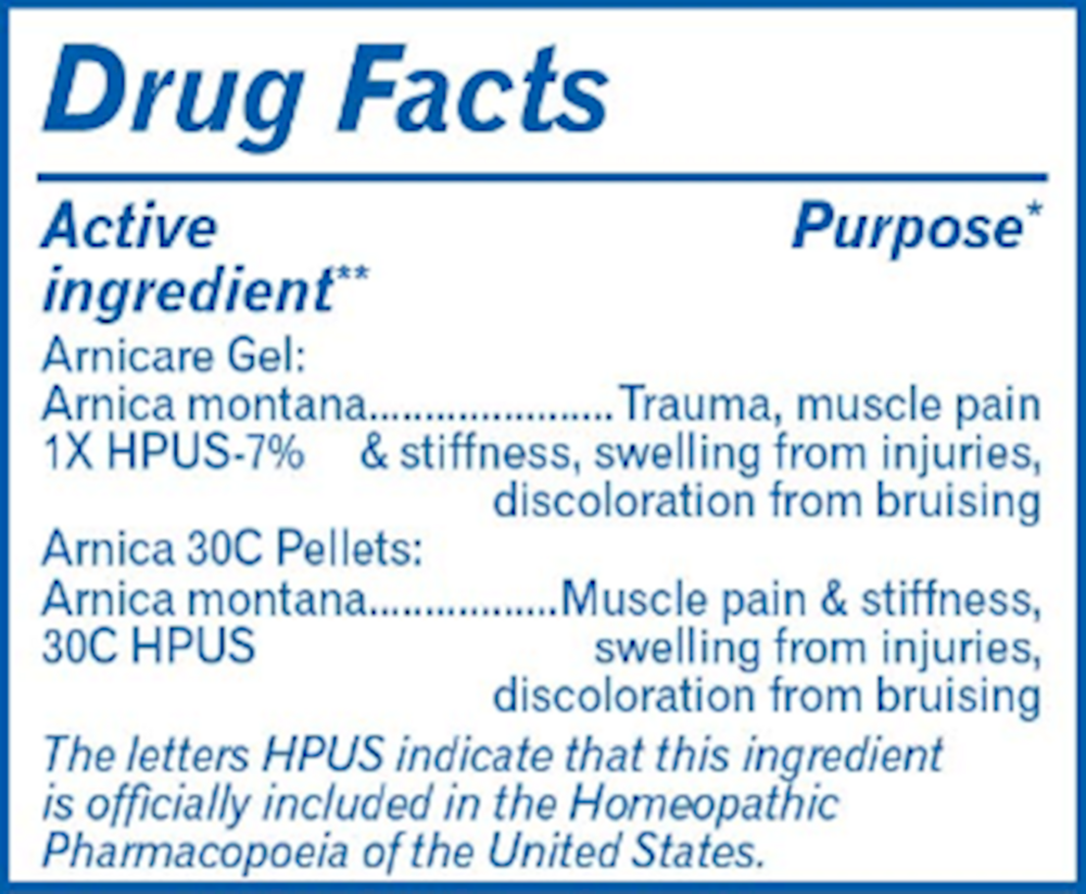 Made with fresh mountain daisies (Arnica montana), Boiron's line of pain relievers reduce everyday muscle aches, stiffness, swelling from injuries, and bruises.* The Value Pack conveniently pairs two of the most popular forms of Arnica: Arnicare Gel for external spot treatment and Arnica montana 30C pellets for general internal action. The odorless, non-greasy gel is cooling and quickly absorbed by the skin. The pellets melt under the tongue and do not interact with other medications or supplements. Neither the gel nor the pellets mask symptoms that may indicate a more serious problem. Available over the counter, the Arnicare Gel MDT Value Pack contains the gel in a 2.6 oz tube and an easy dispensing tube of approximately 80 pellets. Boiron's pain relief line includes a cream, ointment, tablet, and arthritis pain formula.*Claims based on traditional homeopathic practice, not accepted medical evidence. Not FDA evaluated.
