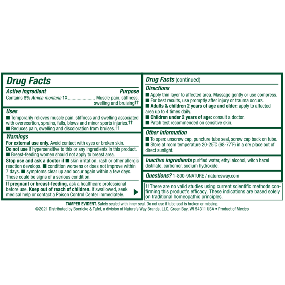Apply thin layer to affected area. Massage gently or use compress. Arnica montana 1X HPUS 8% Inactive ingredients: carbomer, ethyl alcohol, purified water, sodium hydroxide, witch hazel.
