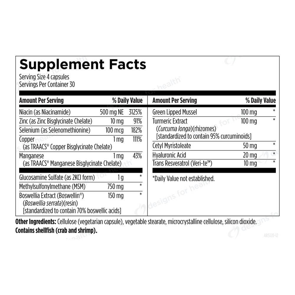 ArthroSoothe™ provides joints with nutritional support for lubrication, free movement, and healthy function.* Joints, cartilage, ligaments, tendons, and synovial fluid (for joint lubrication) undergo a continuous, but slow turnover and remodeling process. This is affected by many physiological factors, such as diet, supplements, activity, stress, gut health, immune status, infections, aging, hormones, toxic load, and/or various medications.