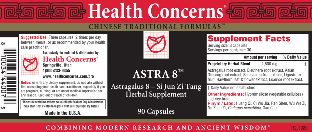 Astragalus root (huang qi), Eleuthero root extract (ci wu jia), Asian Ginseng root extract (ren shen), Schisandra fruit extract (wu we zi), Ligustrum fruit (nu zhen zi), Hawthorn leaf & flower extract (Crataegus pinnatifida), Licorice root (gan cao).