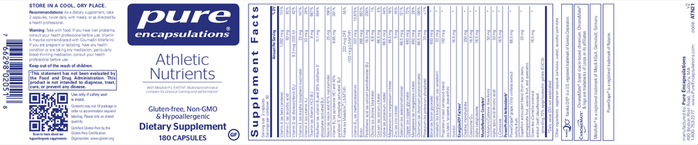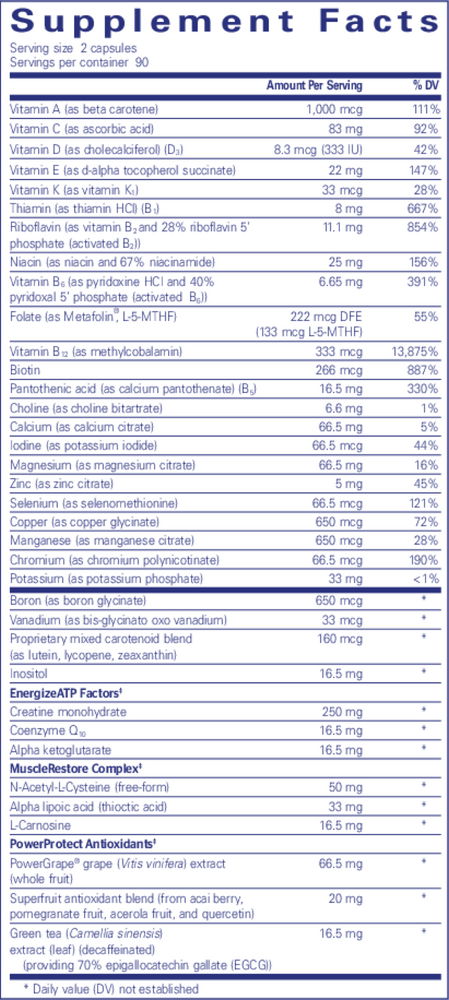 Athletic Nutrients is a complete, highly bioavailable multivitamin, multi-mineral and trace element supplement designed for physically active individuals and athletes. The formula combines bioavailable minerals, activated vitamins, antioxidants and pH-balanced creatine to support energy and endurance, and lessen muscle fatigue. Potassium, calcium and magnesium are included to support healthy muscle function.1 Copper, manganese, selenium and zinc help to maintain healthy tendons, ligaments and joints.2 Creatine monohydrate supports ATP regeneration and enhances work output in activities such as weightlifting and sprinting.3 NAC, alpha lipoic acid and l-carnosine support muscle recovery and comfort. In a placebo-controlled, high intensity exercise study, NAC promoted a healthy cytokine balance and supported muscle comfort.