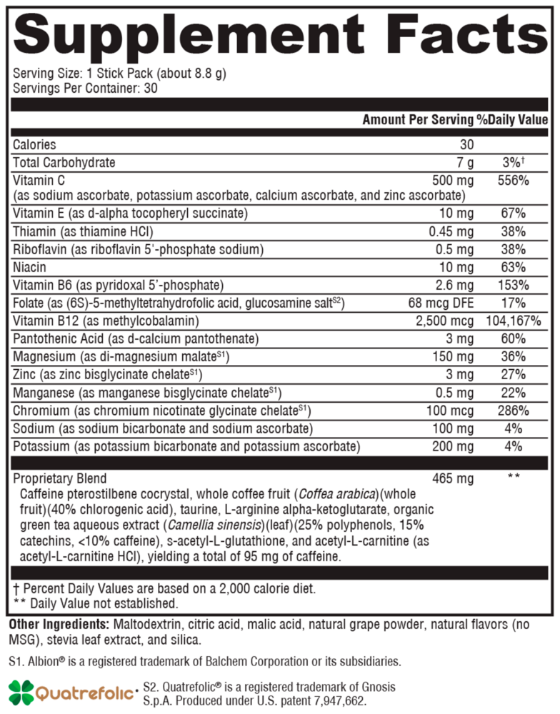 ATP Ignite™ transforms water into a great-tasting, revitalizing energy drink. Each stick provides a combination of B vitamins, electrolytes, trace minerals, amino acids, herbs, and antioxidants to fuel your body’s energy production. Building on these important nutrients, this formula also features a caffeine pterostilbene cocrystal. Initial reports suggest that this cocrystal’s caffeine may be absorbed more slowly and stay in your system longer than regular caffeine, which may help your energy last longer. With just 7 g of carbohydrate per serving and zero sugars, this formula gives your body what it needs to produce energy.*