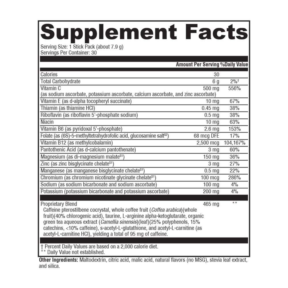 Each stick provides a combination of B vitamins, electrolytes, trace minerals, amino acids, herbs, and antioxidants to fuel your body’s energy production.* Building on these important nutrients, this formula also features a caffeine pterostilbene cocrystal. Initial reports suggest that this cocrystal's caffeine may be absorbed more slowly and stay in your system longer than regular caffeine, which may help your energy last longer.* With just 6 g of carbohydrate per serving and zero sugars, this formula gives your body what it needs to produce energy.*