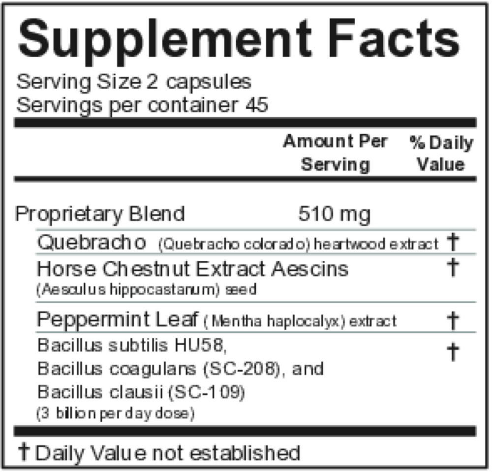 Ingredient Quantity Proprietary Blend 510 mg Quebracho heartwood extract - Horse Chestnut Extract Aescins seed - Peppermint leaf extract - bacillus subtilis hu58 - Bacillus coagulans (SC-208) - Bacillus clausii (SC-109) -Serving size: 2 Capsule