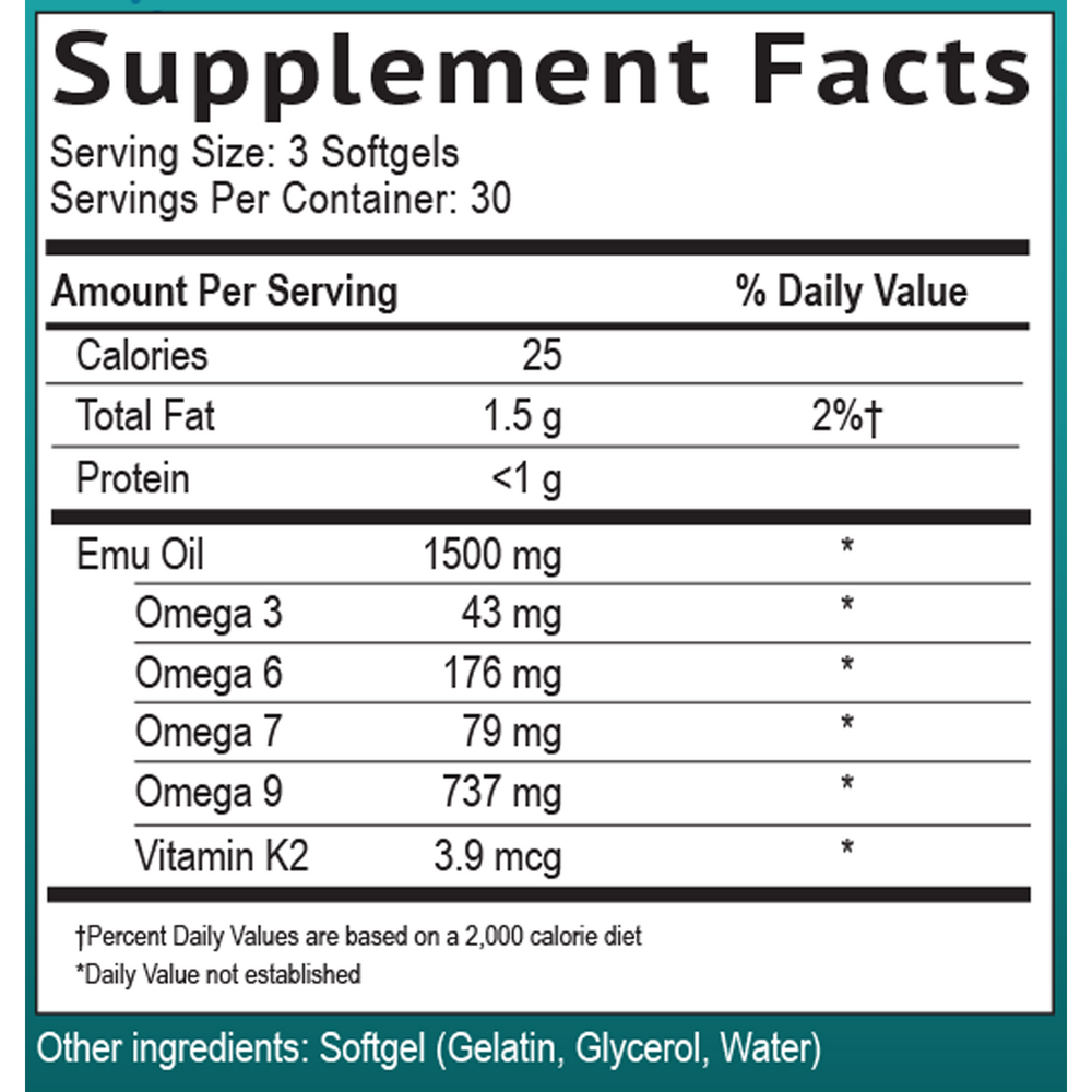 100% Pure Australian Emu Oil. Sustainably sourced from grass-fed emus in Southeast Australia. This traditional fat from the grandiose, Heritage-bred emu bird contains a synergistic combination of unadulterated, natural nutrients, especially vitamin K2 (MK-4), omega fatty acids (3, 6, 7, 9) and conjugated linoleic acid.