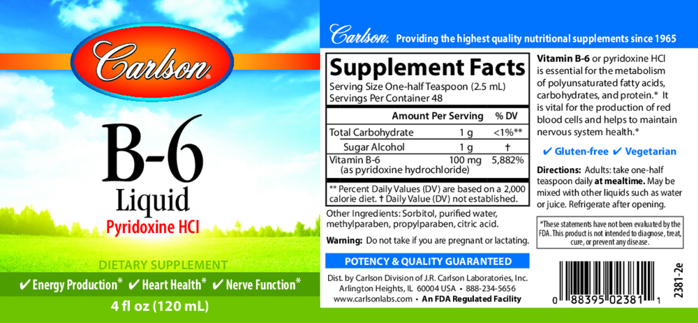 If you have trouble swallowing pills, Carlson Vitamin B-6 liquid is an easy alternative. Each 1/2 teaspoon provides 100 mg of vitamin B-6 and is sweetened with sorbitol, naturally found in fruit. Vitamin B6 is an important part of the B-complex group. It helps convert food to energy, supports red blood cell formation, promotes cardiovascular and nervous system health, and helps maintain skin and hair health.*