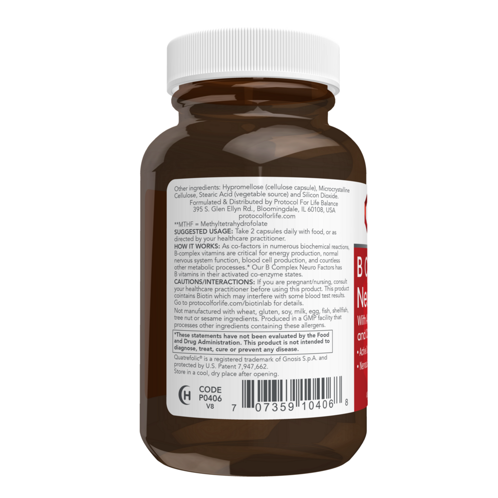As co-factors in numerous biochemical reactions, B Complex vitamins are critical for energy production and the proper metabolism of carbohydrates, fats, and proteins.* B Vitamins are also important for the maintenance of normal nervous system function, blood cell production, and countless other metabolic processes.* Our B Complex Neuro Factors has a balanced combination of B Vitamins in their activated Co-Enzyme states.