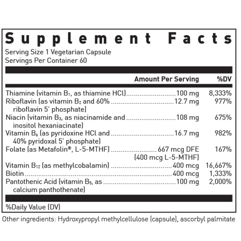 B-Complex offers a comprehensive blend of B vitamins including pyridoxal-5-phosphate, riboflavin-5-phosphate and folate as 5-methyltetrahydrofolate (5-MTHF), the universally metabolized and biologically active form of folate designed to support cellular, cardiovascular, neurological and psychological health.*