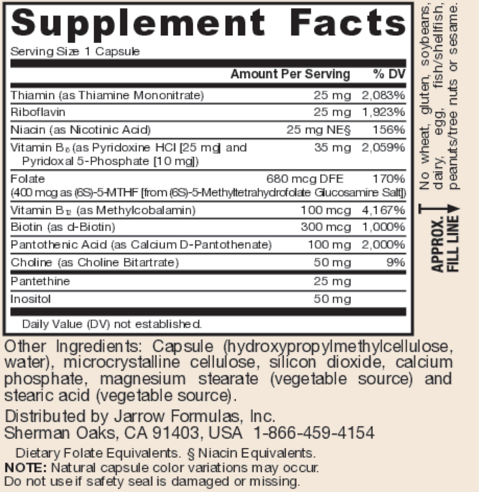 "Jarrow Formulas® B-Right is an optimized B-complex featuring the forms of vitamins B1 (thiamin), B2 (riboflavin), B5 (pantethine), B6 (P-5-P), B12 (methylcobalamin), and B9 (methyl folate) that are efficiently utilized by the body.* B vitamins play an important role in the body, including cellular energy production, immune health, and stress management.*"