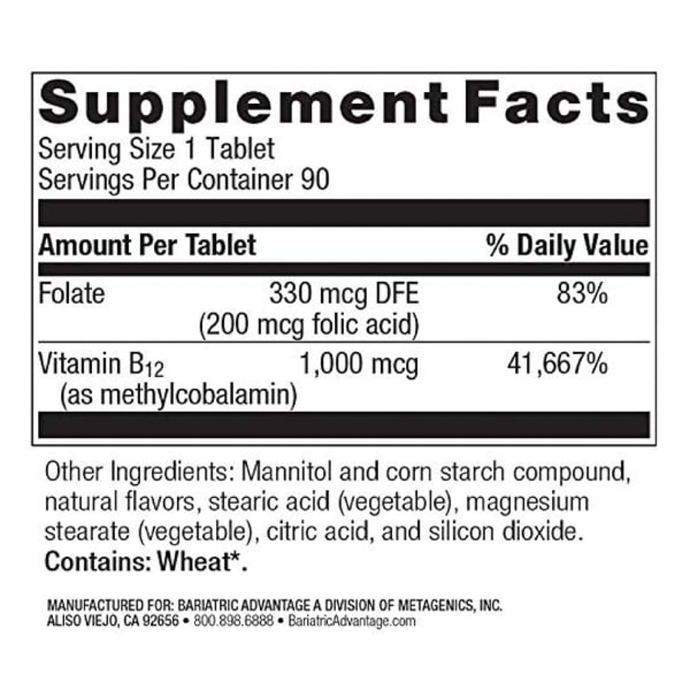 Bariatric Advantage B12 SpeedyMelt®s are fast melting delicious tablets that deliver 1,000 mcg of high-quality vitamin B12 and 200 mcg folic acid for collaborative nutritional support. Bariatric surgery can increase the risk for Vitamin B12 deficiency, which has been reported in patients of all bariatric procedure types.1 Excess weightis also a risk factor for vitamin B12 deficiency.2 Patients of certain bariatric procedure types may have limited intrinsic factor,3 a substance produced in the lower part of the stomach, which is needed to absorb vitamin B12. Additionally,certain medications that many patients take before and after surgery can decrease vitamin B12 absorption and stores in the body. ASMBS guidelines call for 1,000 mcg ofvitamin B12per day for Gastric Bypass (RYGB/RNY) and Vertical Sleeve Gastrectomy (VSG/SG) patients.4 Vitamin B12 is a cofactor in essential physiological reactions, and plays a very role for important nerves, brain, heart, blood cell production, and DNA, Adequate B12 helps maintain energy metabolism.* Andres E, et al. Vitamin B12 deficiency in elderly patients. CMAJ. 2004:171;251-9. Baltaci D, et al. Association of vitamin B12 with obesity, overweight, insulin resistance, and metabolic syndrome, and body fat composition; primary care-based study. Med Glas (Zenica). 2013 Aug;10(2):203-10. Hamad, Giselle G. et al. "The Effect of Gastric Bypass on the Pharmacokinetics of Serotonin Reuptake Inhibitors." Am Journ Psychiatry 169.3 (2012): 256–263. PMC. Web. 27 Feb. 2017. Mechanick, Jeffrey I. et al. Clinical Practice Guidelines for the Perioperative Nutritional, Metabolic, and Nonsurgical Support of the Bariatric Surgery Patient—2013 Update: Cosponsored by American Association of Clinical Endocrinologists, The Obesity Society, and American Society for Metabolic & Bariatric Surgery.
