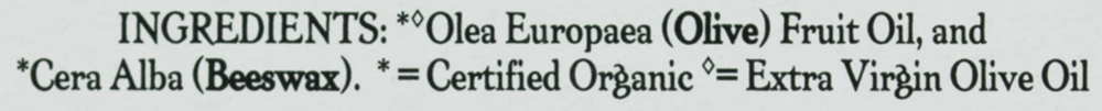 • Only two simple ingredients: Organic Extra Virgin Olive Oil & Organic Beeswax.