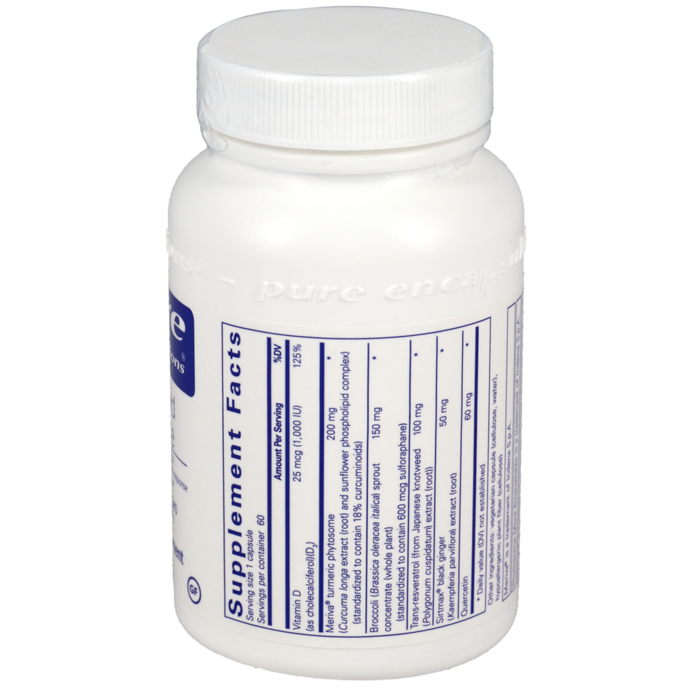 The PureResponse™ formula Balanced Immune is designed to support immune balance and tissue integrity, in part by targeting the NLRP and NF-κB pathways to modulate cytokine production. NLRP (NOD-like receptor proteins) act as intracellular sensors to oxidative and environmental stressors. Research suggests curcumin and vitamin D support healthy cellular response, in part by modulating this pathway. Curcumin is included in this formula as clinically researched and patented Meriva® curcumin-phosphatidylcholine complex. The complex offers enhanced efficiency of absorption and resistance to degradation in the digestive tract. Pharmacokinetic data suggests a 20-fold increase in relative absorption compared to standard curcumin. The formula also promotes numerous enzyme and gene transcription pathways targeting nutrient metabolism in the liver, detoxification, and cellular protection against oxidative stress. Black ginger and resveratrol promote healthy SIRT1 protein levels. SIRT1 supports cellular homeostasis, plays an important role in insulin secretion and glucose homeostasis through numerous enzyme and gene transcription pathways, and affects glucose and lipid metabolism in the liver by modulating the activity of the nuclear receptor PPAR-gamma. In a double-blind, placebo-controlled, crossover study, 100 mg of SIRTMAX® black ginger extract for seven weeks supported healthy glucose metabolism and weight management*, while in vitro studies on its active constituents suggest a five-fold increase in SIRT1 activity compared to resveratrol. Sulforaphane and resveratrol modulate the activity of Nrf2. Nrf2 is a transcription factor that supports cellular function by promoting robust, long-lasting expression of numerous genes by promoting cellular protection against oxidative stress and detoxification.*