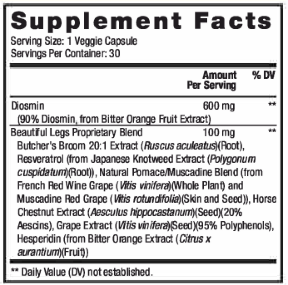 Packed with antioxidants, our team favorite Beautiful Legs capsules features a blend of trans-Resveratrol sourced from wildcrafted Polygonum cuspidatum, Grape Seed Extract and Diosmin. This daily supplement is an essential to help maintain the health and look of your legs, having been clinically tested to help maintain the desired structure of your veins.* It features ingredients which support proper blood circulation, and utilizes a powerful formula to prevent the appearance of spider veins to support circulation and oxygenation.* The result? Smoother, youthful looking legs.*