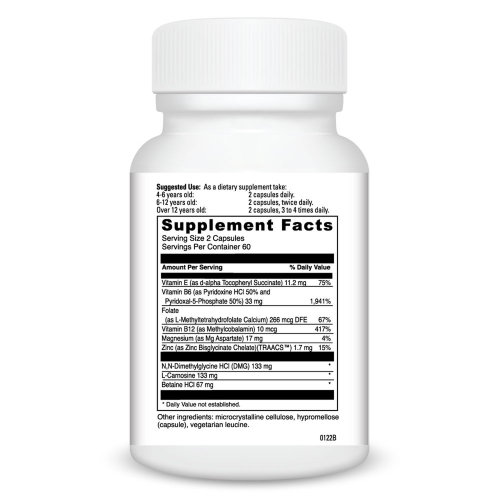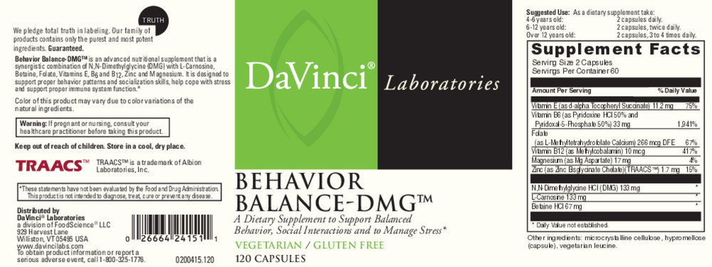 Behavior Balance-DMG™ is an advanced nutritional supplement that combines our patented N,N-Dimethylglycine (DMG) with betaine, folic acid, vitamins E, B6 and B12, l-carnosine, zinc, and magnesium in an easy to swallow enteric coated capsule. These nutrients work synergistically to balance behavior patterns and socialization skills, as well as to support stress coping mechanisms and immune system function.*