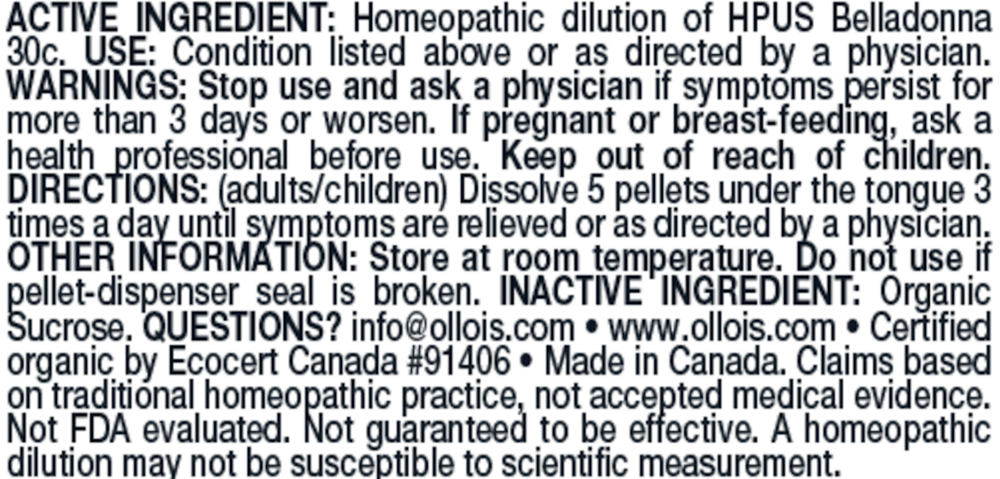 Homeopathic. Local and recent symptoms. Ollois organic certified and lactose free Belladonna 30C is traditionally used for: fever, headache, and inflammation.†