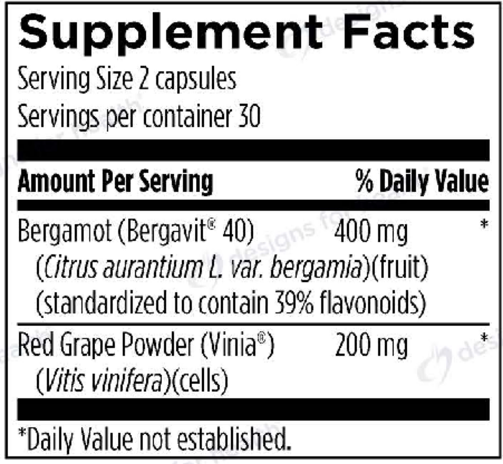 BergaVin™ features the trademarked ingredients Bergavit® 40 bergamot and Vinia® red grape powder with research demonstrating their potential to support cardiovascular health. These ingredients also support antioxidant status and promote a healthy inflammatory response.