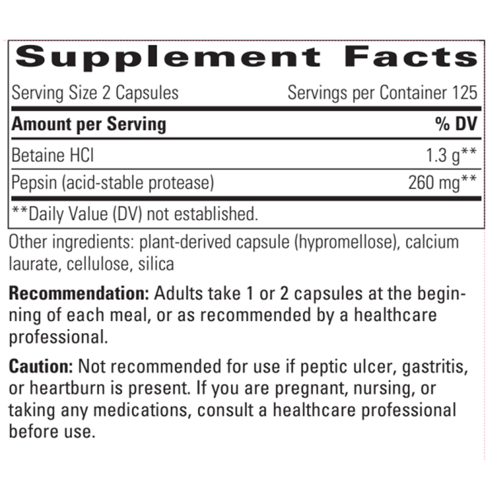 • Adequate amounts of hydrochloric acid are necessary for the absorption of vitamins and minerals, and to maintain a sterile environment in the stomach.*• Pepsins represent approximately 70% of the protein-digesting enzymes needed to convert the protein in food into usable amino acids.• Easy-to-swallow vegetarian capsules