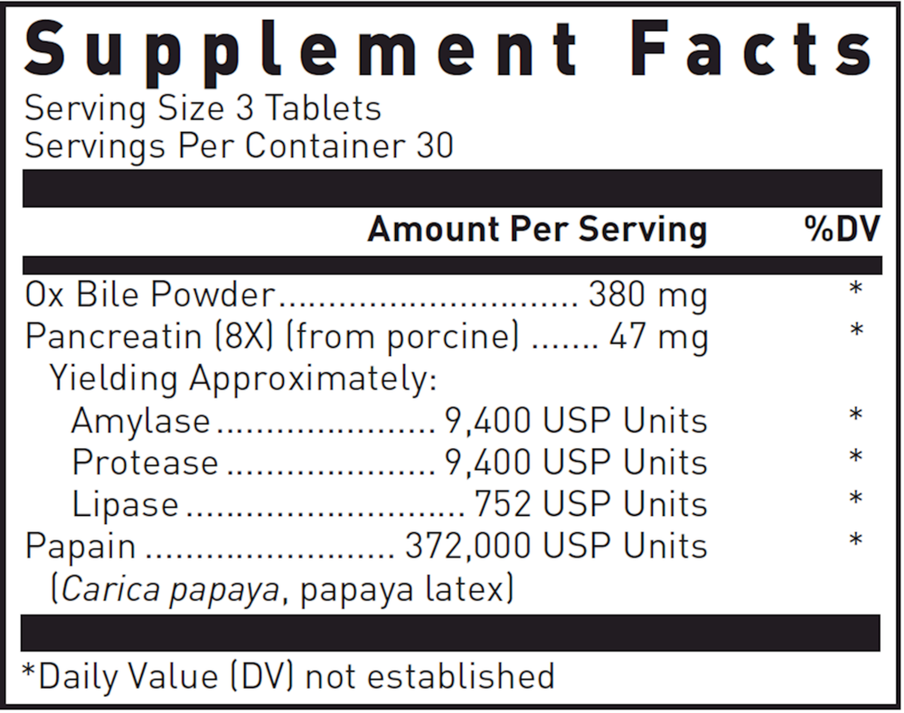 Bilex is a dietary enzyme formula with pancreatin and papain for protein, carbohydrate and fat digestion, along with the addition of ox bile extract to help break down and assimilate lipids in the intestinal tract.*