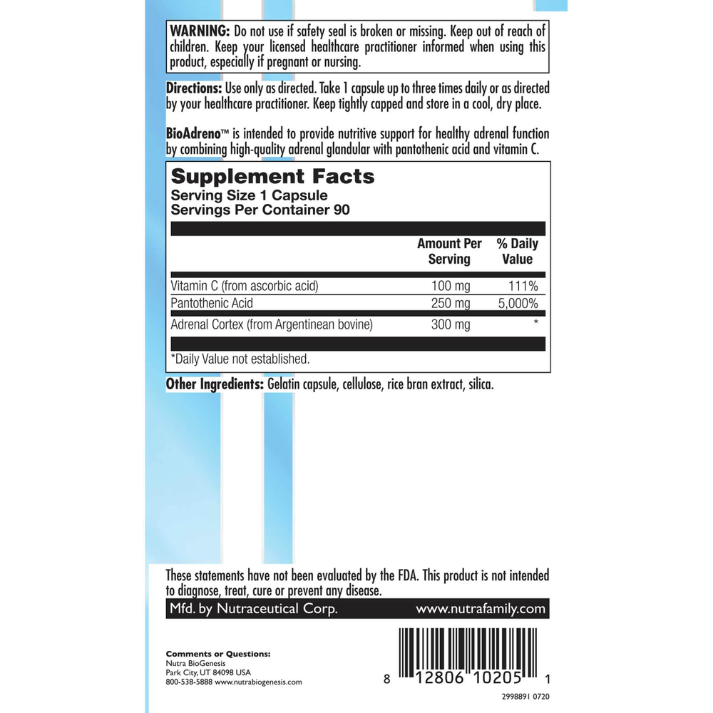 BioAdreno is an innovative formula intended to provide nutritive support for healthy adrenal function by combining high-quality Argentinean bovine adrenal cortex with pantothenic acid and vitamin C.* At this potent dose, pantothenic acid (vitamin B5) supports cellular energy and cellular energy metabolism, as well as nerve function and nervous system health.* This three-ingredient formula provides potent support for healthy adrenal function in one convenient capsule.*
