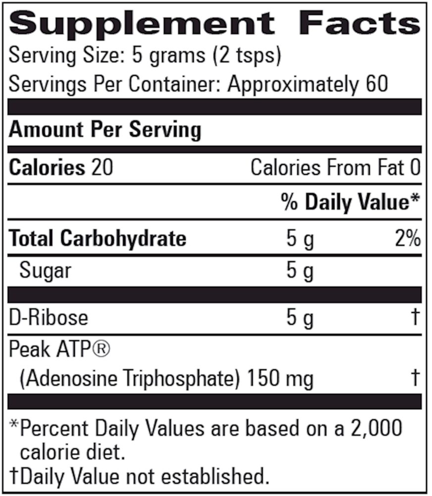 Ribose, a naturally occuring substance used by every cell in the body to build energy. It is the critical compound in heart energy and the most fundamental building block of adenine triphospate (ATP), the primary source of energy for every cell in the body. This product also contains PEAK ATP developed through a proprietary fermentation process, PEAK ATP delivers the exact molecule the human body needs to create energy. Studies show that PEAK ATP can elevate both intracellular and extracellular ATP levels.*